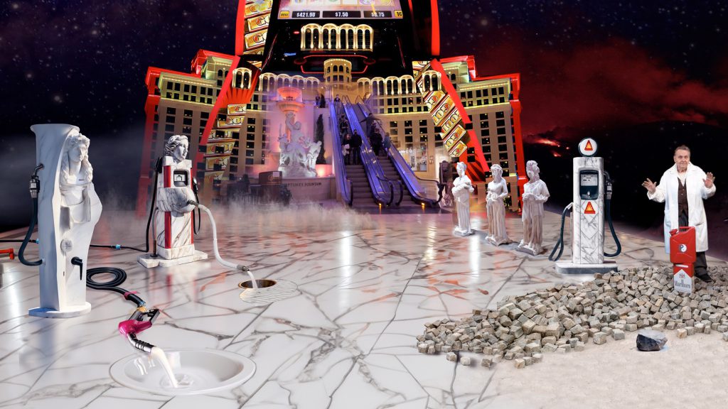 Ein gemäldehaftes Panorama des US-Westens. Zwischen imperialen, römischen Fake-Bauten steht Julian Assange als Brausehersteller und sinniert über die Digitalisierung unserer Welt. Um ihn herum suchen Hippies, Künstler und Obdachlose nach Ausdruck, während ihre Messages von Überwachungskameras eingefangen werden.